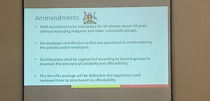 Dr Byakika highlighted some of the amendments made to the bill which include; mandatory contributions of all above 18 years including indigenes and vulnerable groups (these contribute to about 19 – 22% of the population).