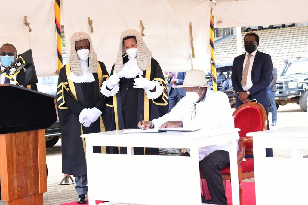 President Museveni flanked by Speaker Anitah Among and Deputy Speaker Thomas Tayebwa at Kololo