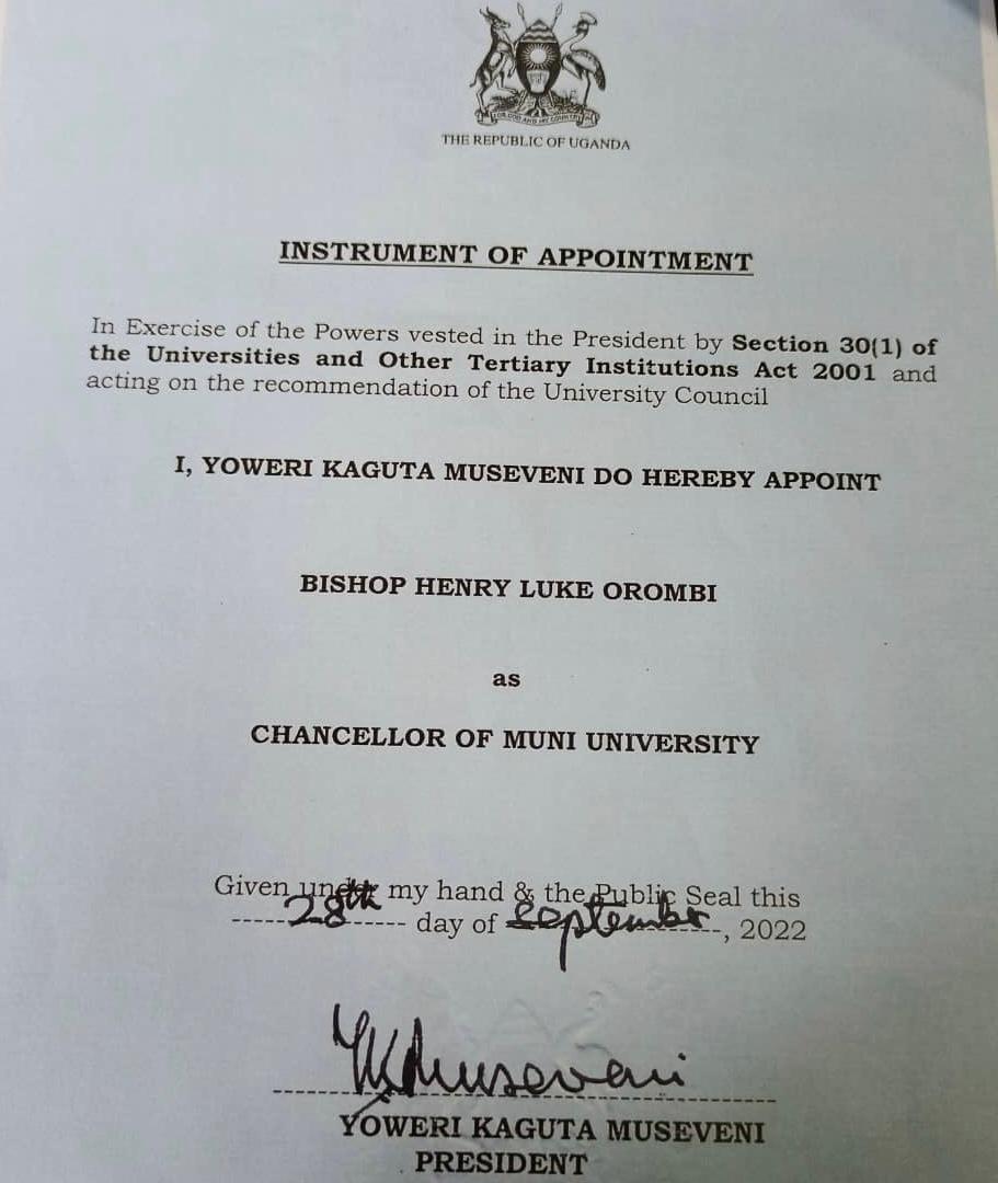 President Museveni has appointed Bishop Henry Luke Orombi as the Chancellor of Muni University.