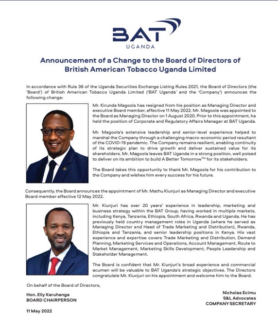 At BAT, Kirunda will be replaced by Mathu Kiunjuri as the Managing Director and Executive Board Member effective 12 May 2022.