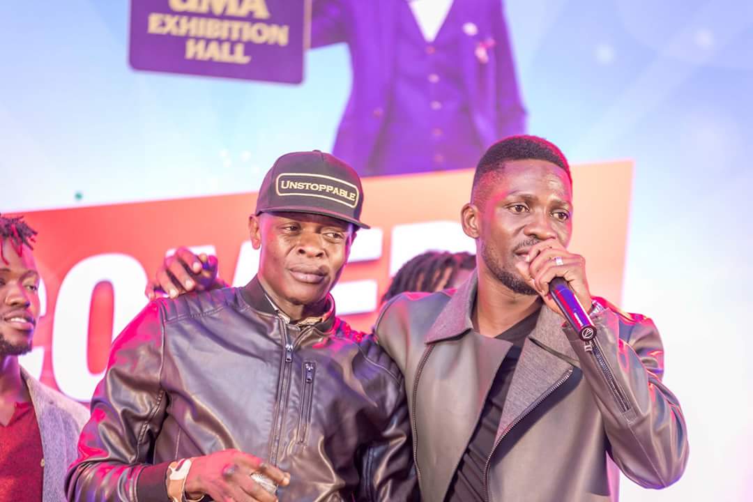 Singers Jose Chameleone (L) and Bobi Wine (R) share a light moment on stage at Comedy Store on Thursday