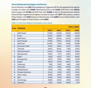 The report highlights disparities across policing regions, with Kampala Metropolitan areas dominating the list of high-crime zones.