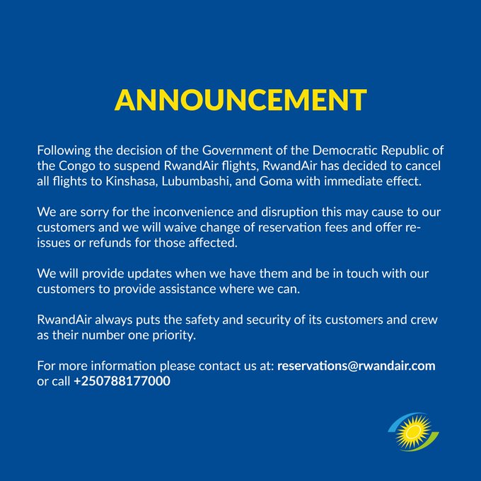 In response, RwandAir issued a statement on Saturday announcing flight suspensions to the cities of Kinshasa, Goma and Lumbubashi.
