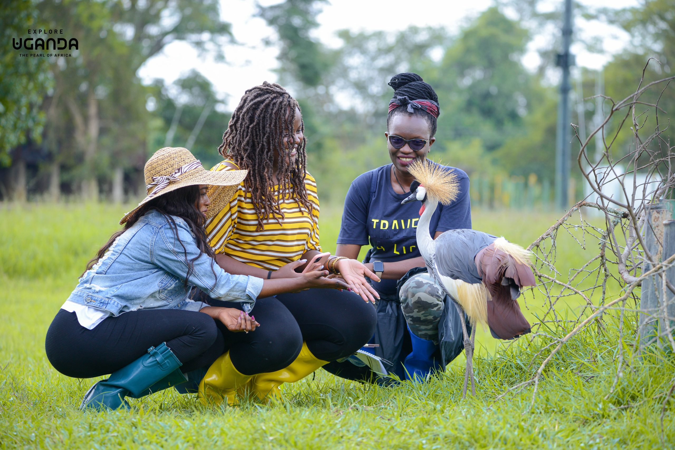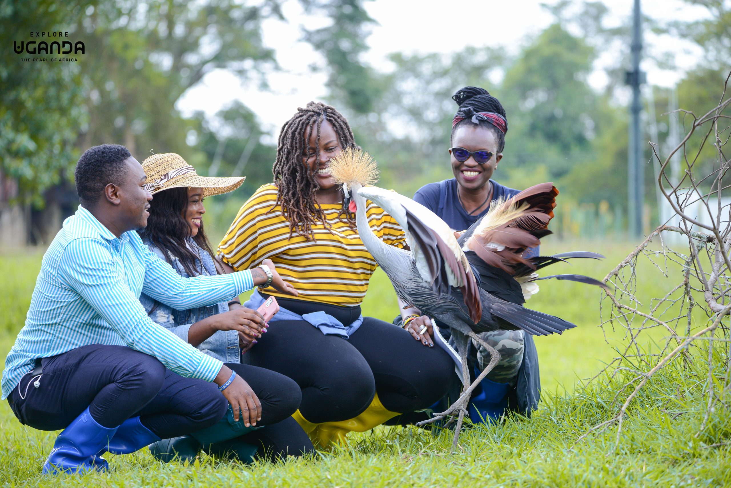 Journalists playing with a crested crane