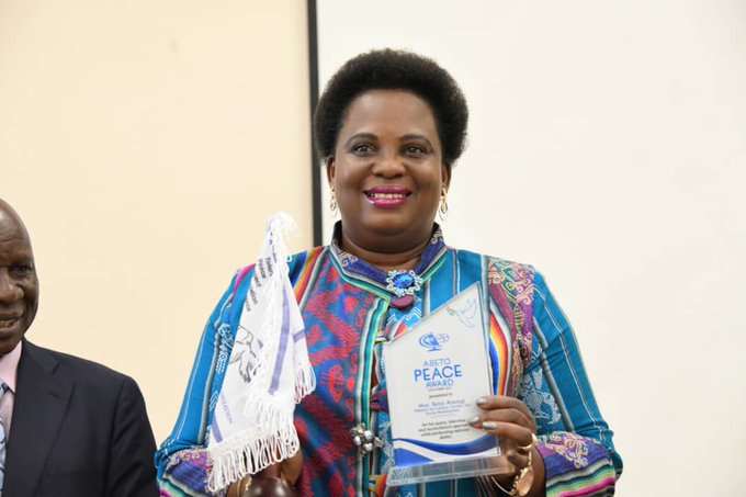 “I have received my award, from ABETO, as Ambassador of peace; this is in recognition of my work in promoting tolerance, coexistence, diversity and building bridges,” tweeted Minister Amongi.