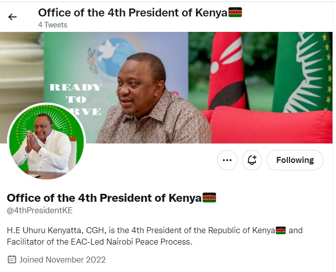 NTV Kenya reports that Kenyatta is now using an official account @4thPresidentKE, which is available on both Facebook and Twitter platforms.