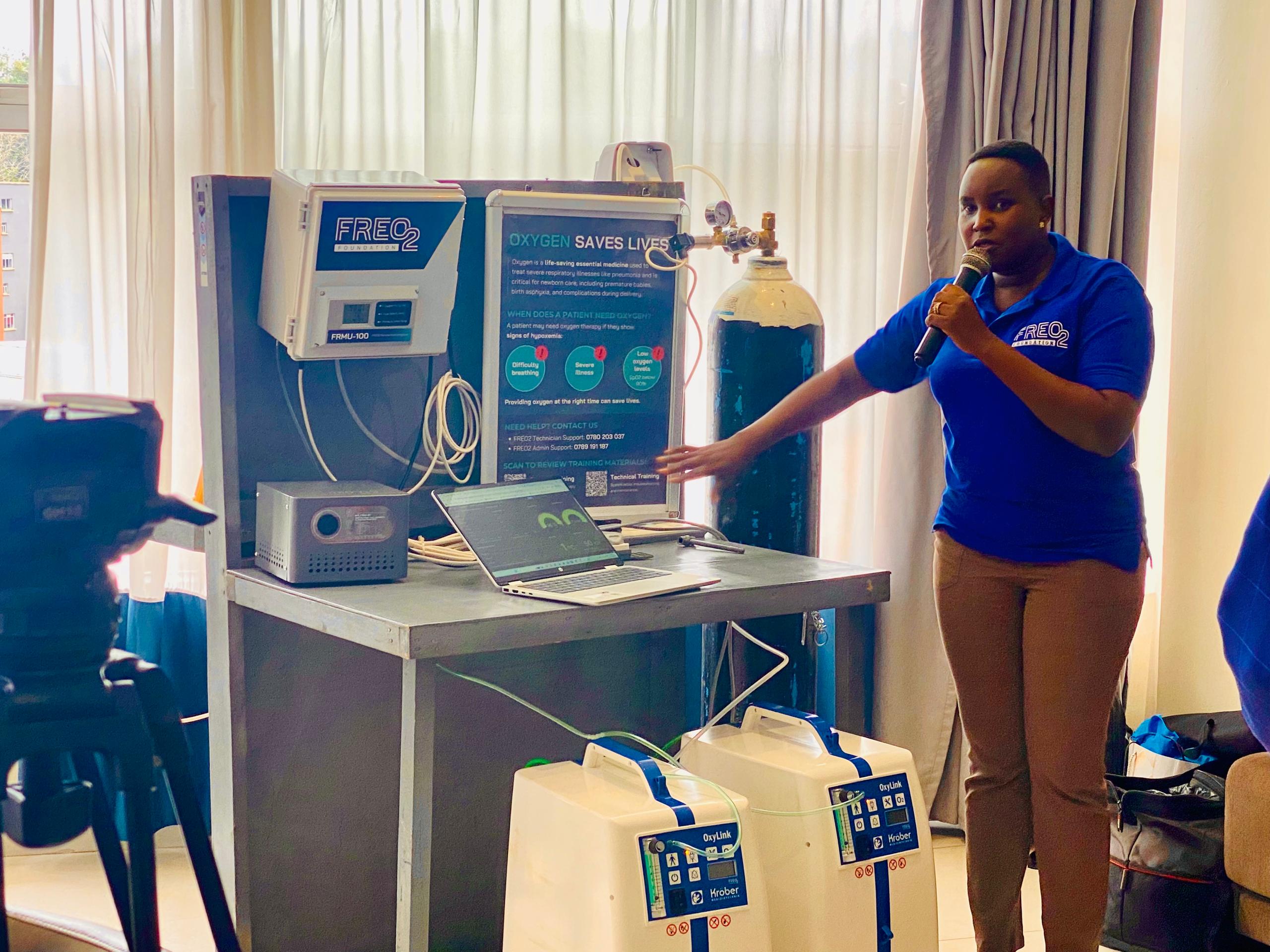Engineer Hilda Bugingo, an oxygen engineer at FREO2 Uganda, led a practical demonstration of the system. “Here at the bedside, we have a demonstration patient — a six-year-old child. The flow box contains two flow meters, each capable of delivering up to two litres per minute. Clinicians adjust the oxygen and monitor the patient’s response. This is where healthcare workers interact directly with the system,” she explained.