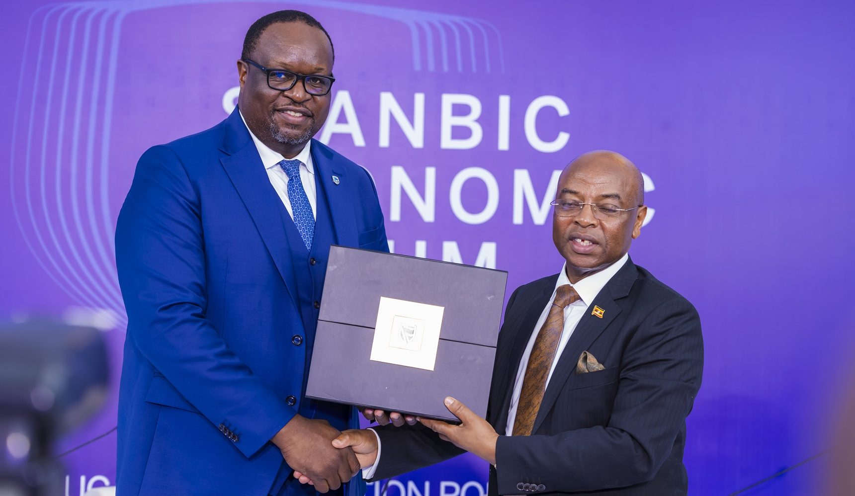 Stanbic Bank CE Mumba Kalifungwa with Prof. Augustus Niwagaba from Bank of Uganda