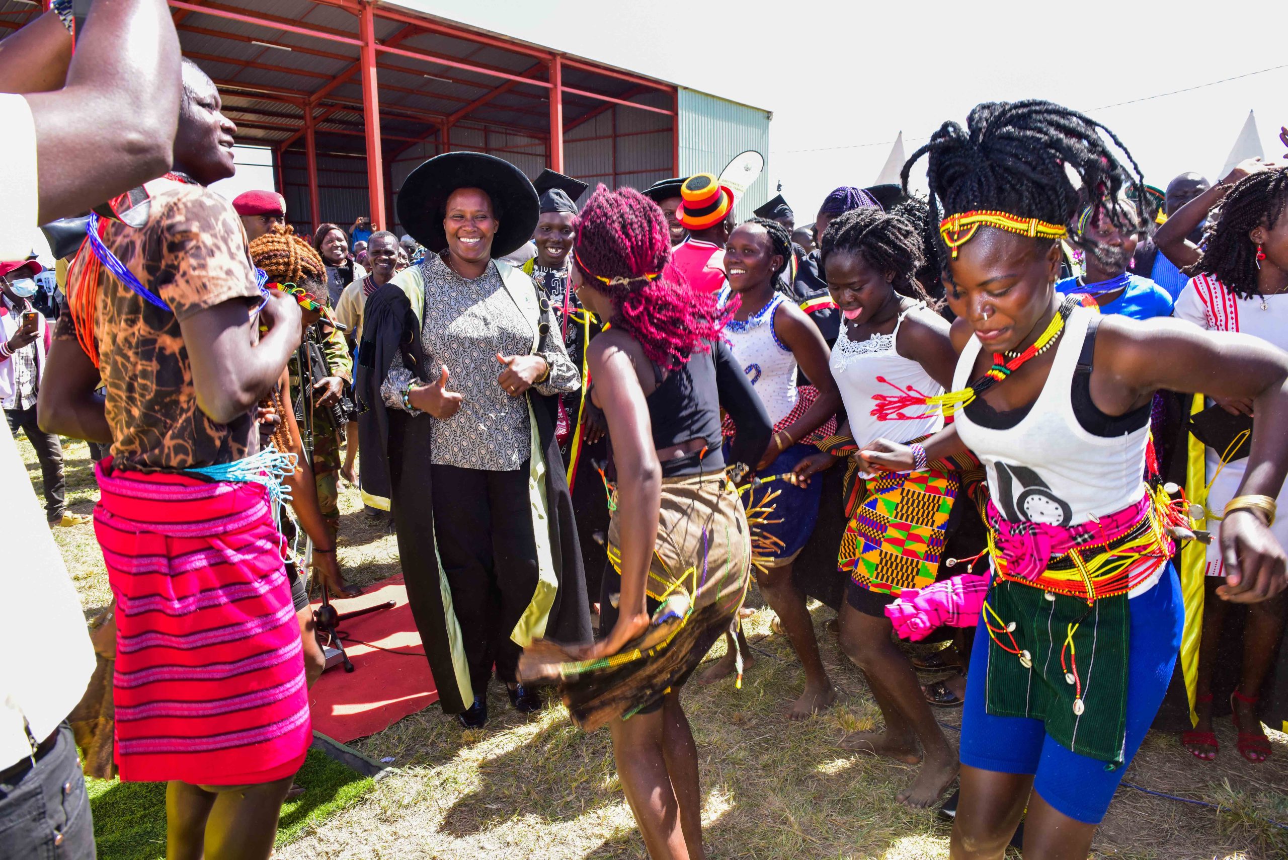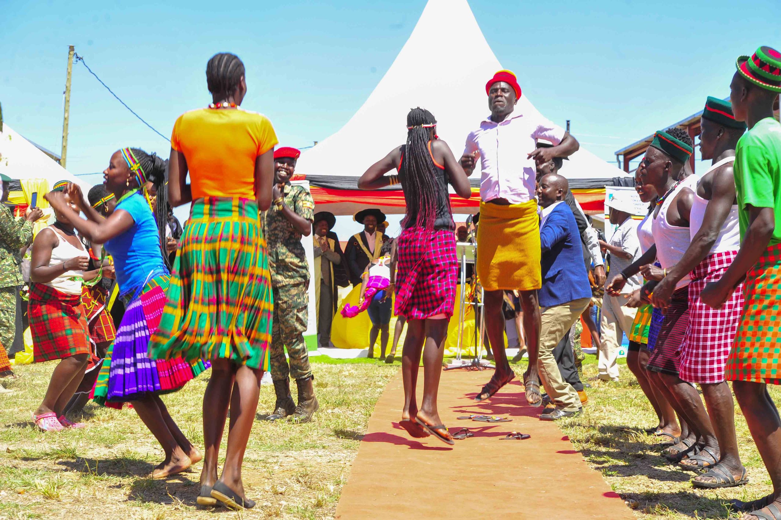 As a sign of appreciation to the President, the Kotido District LC V chairperson, Mr. Lotee Paul Komol dressed Ms. Barekye (who represented Gen. Museveni) in Karamojong culture attire and handed her a spear and a chair.