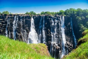 Victoria Falls is a waterfall on the Zambezi River, located on the border between Zambia and Zimbabwe. Here, the Zambezi River plummets over a cliff and into the Boiling Pot before flowing through a series of gorges. The Devil’s Pool, a natural infinity pool, is on the edge of a sheer drop.