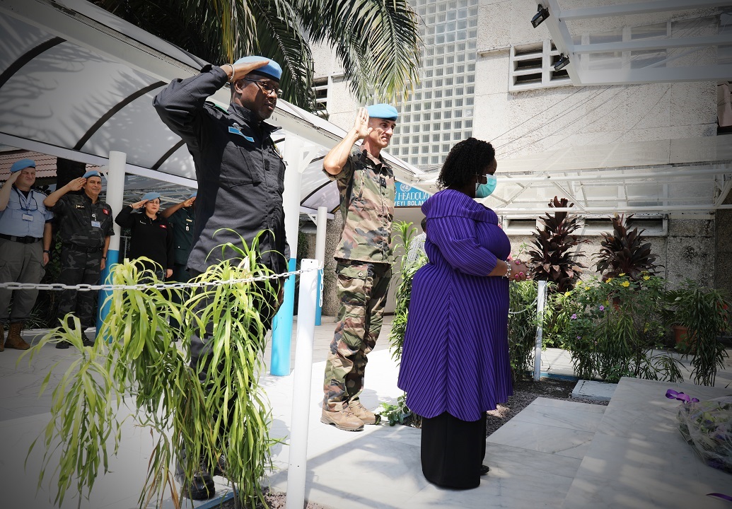 MONUSCO shared an image of it’s Chief Bintou Keita paying tribute to the memory of fallen peacekeepers and placing a wreath at the foot of steel erected in their honor at MONUSCO headquarters in the capital Kinshasa.