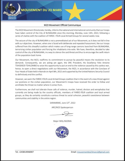 Reuters journalist Fiston Mahamba Wa Biondi quoted FARDC saying that “their withdrawal from Bunagana is tactical to spare casualties on the civilian side as was the wish of Rwanda”.