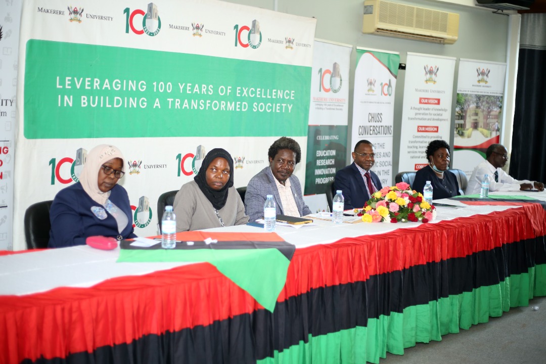 Dr Saudah Namyalo (Dean of the School of Languages, Literature and Communication), Dr Aisha Nakiwala Sembatya (the Acting Head of the Department of Journalism and Communication), Prof. Patrick Mangeni (the Principal College of Humanities and Sciences), Prof Umar Kakumba (the Deputy Vice-Chancellor (Academic Affairs), and Dr William Tayebwa-in white- (former Head of Department Journalism and Communication).