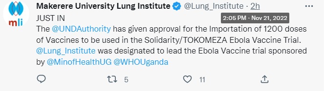“The NDA has given approval for the Importation of 1200 doses of Vaccines to be used in the Solidarity/TOKOMEZA Ebola Vaccine Trial,” the institute announced Monday.