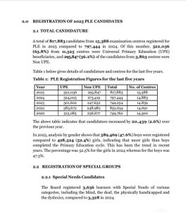 According to UNEB, a total of 817,883 candidates from 15,388 examination centres registered for the examination, an increase from 797,444 candidates in 2024. Of these, 522,036 candidates (63.8 percent) from 11,525 centres were beneficiaries of Universal Primary Education (UPE), while 295,847 candidates (36.2 percent) from 3,863 centres were non-UPE learners.