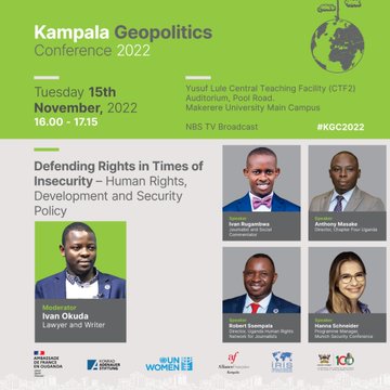 Speakers are; Ivan Rugambwa – Journalist and Social Commentator, Anthony Masake – Director of Chapter Four Uganda, Robert Ssempala – Director of Uganda Human Rights Network for Journalists and Hanna Schneider – Programme Manager, Munich Security Conference.