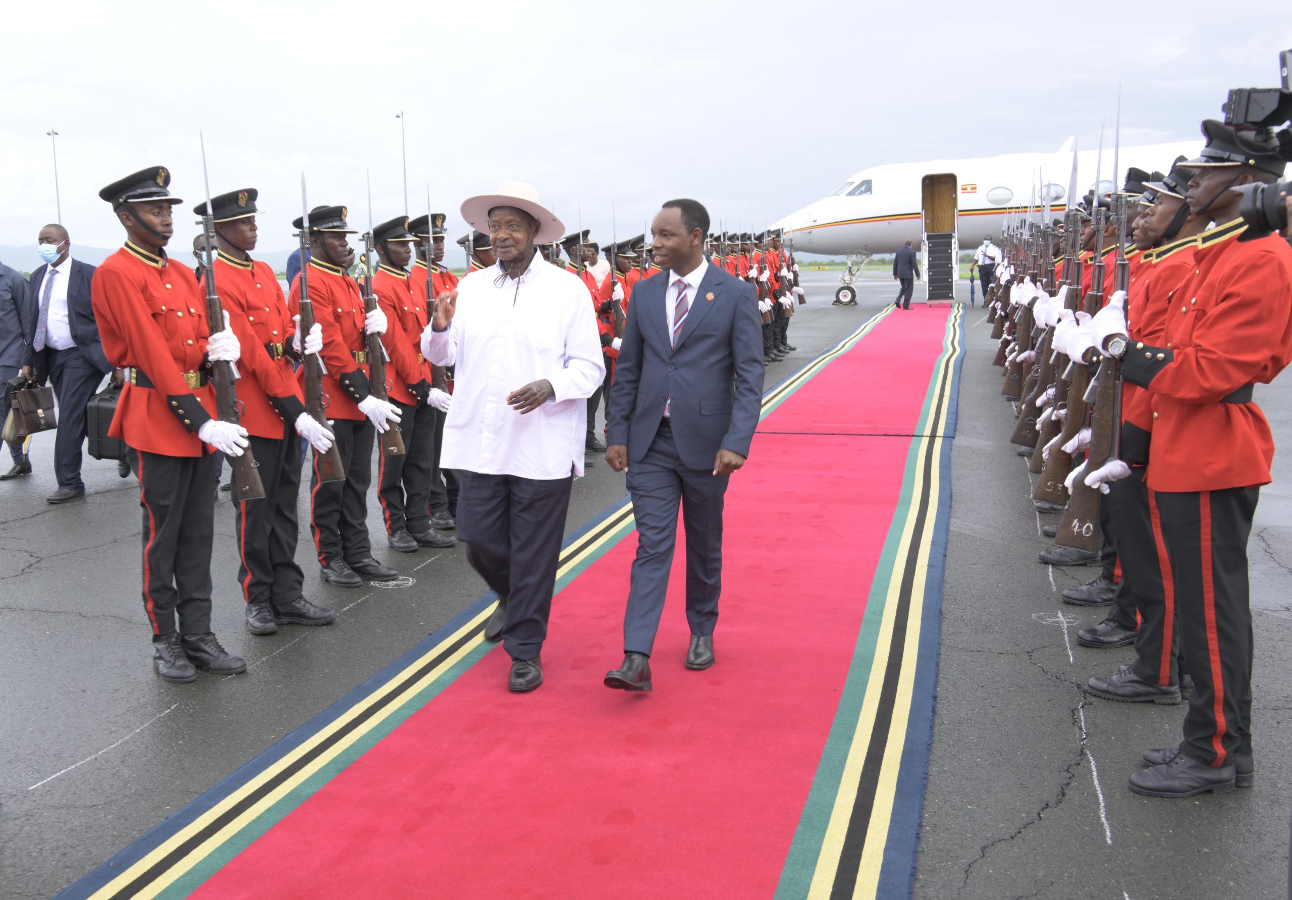 Upon arrival in the northern Tanzanian city, President Museveni was received by a delegation of Tanzanian and Ugandan officials led by Patrobas Katambi and Dennis Londo.
