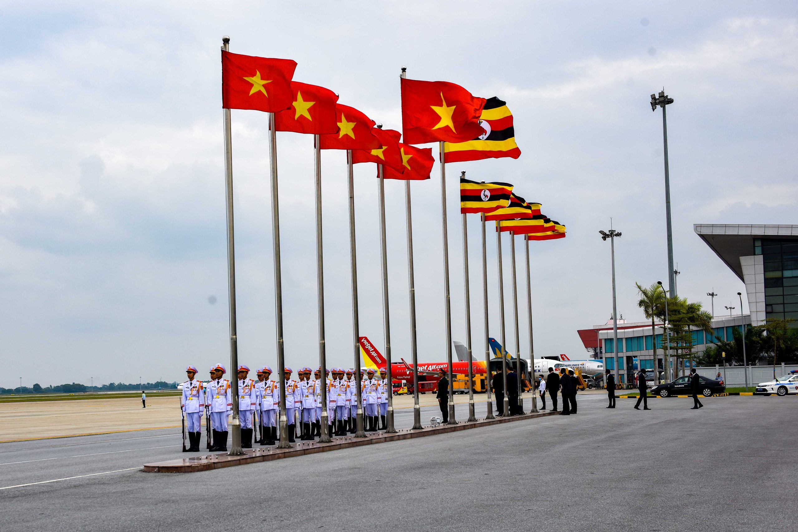 At Noi Bai International Airport in Hanoi, the capital of Vietnam, H.E Museveni was received by the Chairman Office of the President Le Khanh Hai, the Minister of State for Foreign Affairs of Vietnam, Ambassador Nguyen Minh Hang, the Director General in Charge of Middle East and Africa, Mr Bui Ha Nam, and Chief of State Protocol, Nguyen Viet Dzung.
