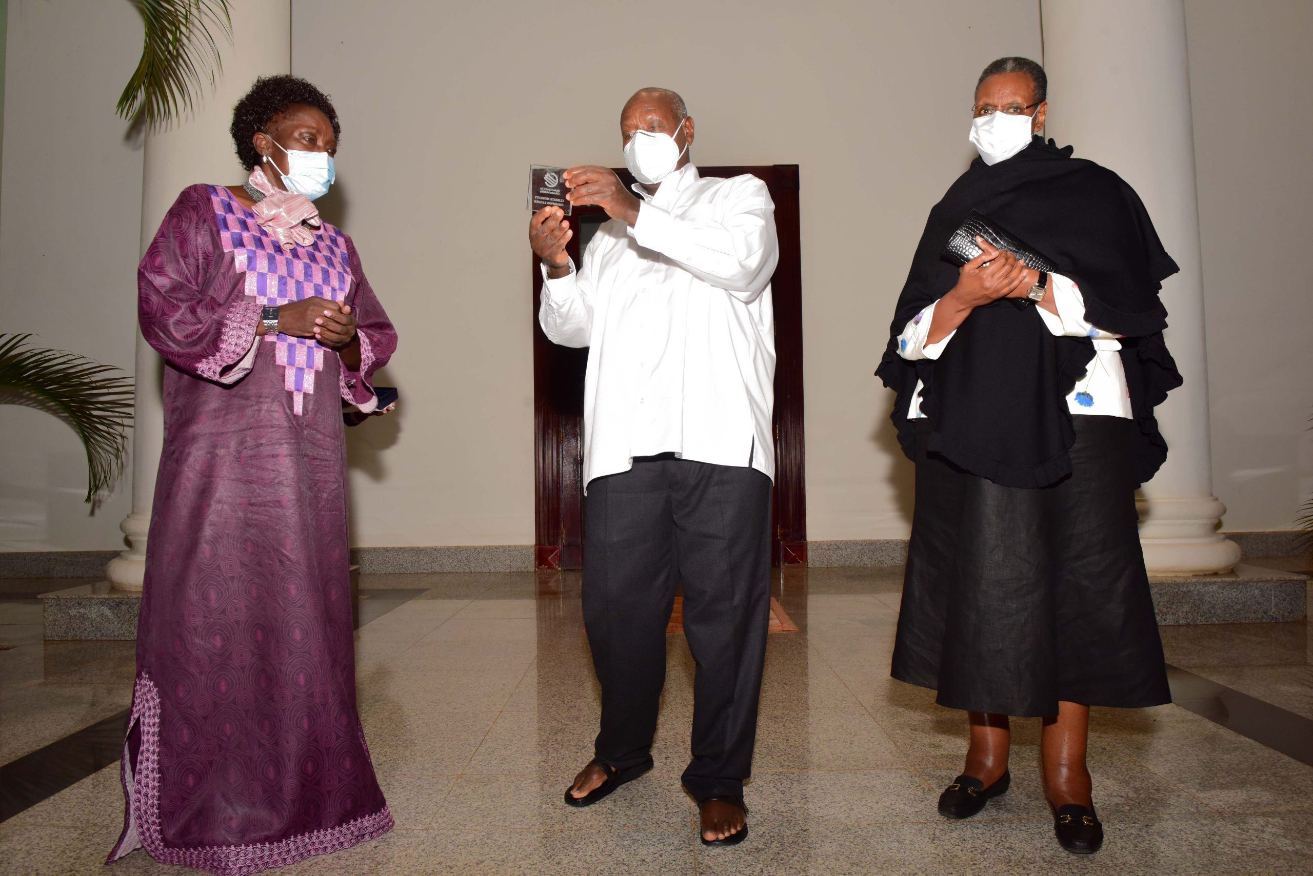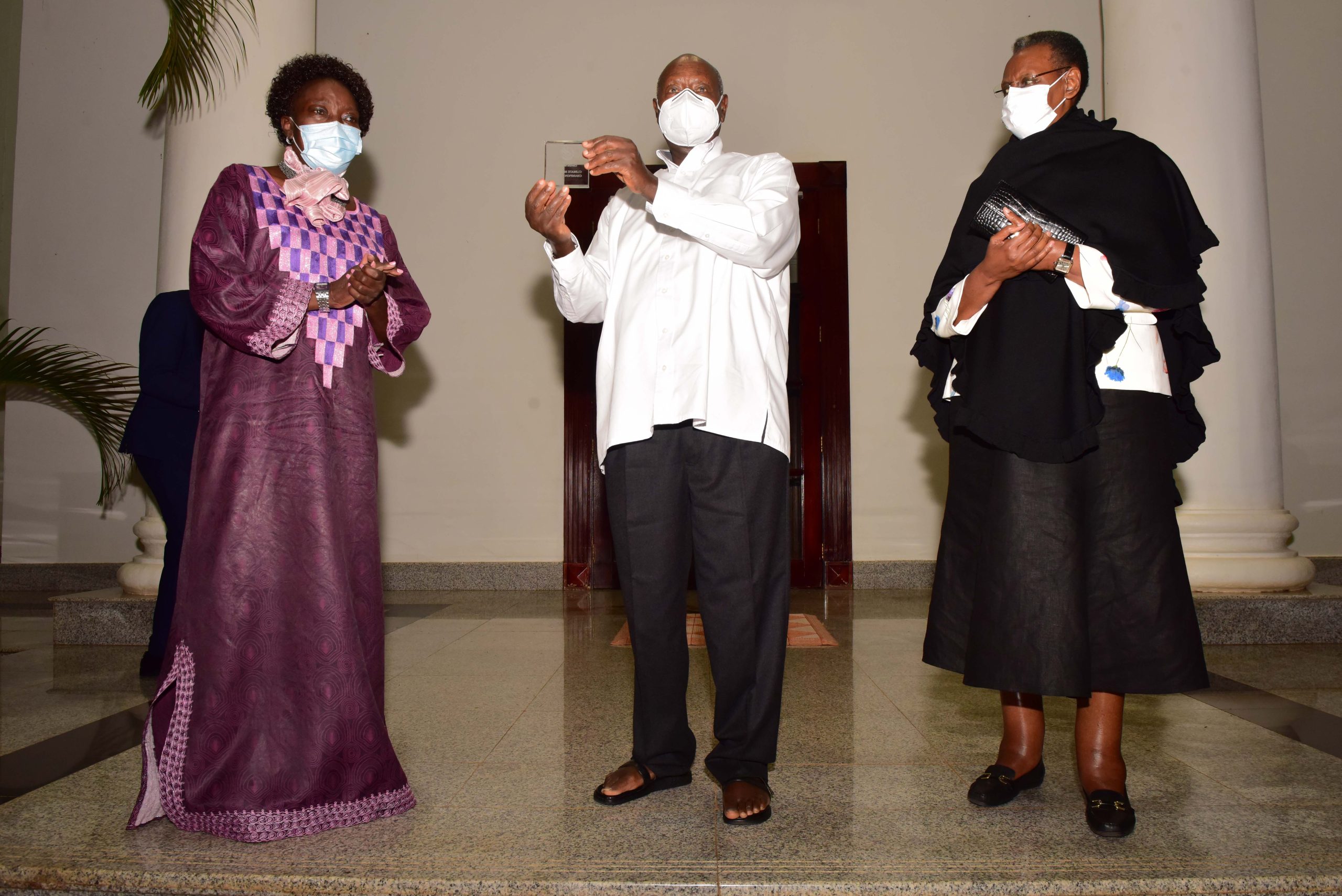 The First Deputy Prime Minister and Minister for East African Affairs, Hon. Rebecca Kadaga who received the award on behalf of the President, delivered it to him yesterday evening at State House, Entebbe. The President was in the company of First Lady Janet Museveni.