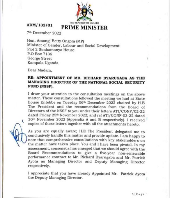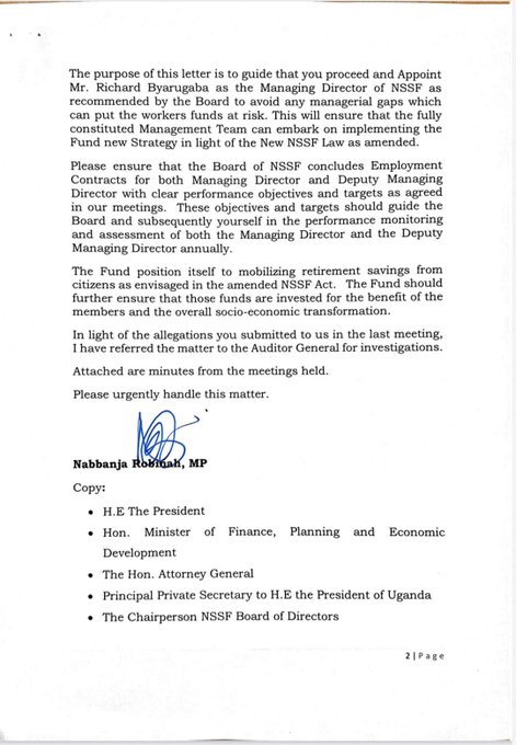 Nabbanja explained that the purpose of the letter was to guide Amongi to proceed and appoint Byarugaba as the Managing Director of NSSF as recommended by the Board to avoid any managerial gaps which can put the workers’ funds at risk.