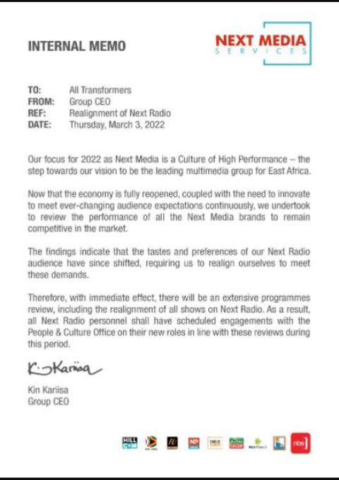 It adds: “With immediate effect, there will be an extensive programmes review, including the realignment of all shows on next radio. As a result, all Next Radio personnel shall have scheduled engagements with the people and culture office on their new roles in line with these reviews during this period.”