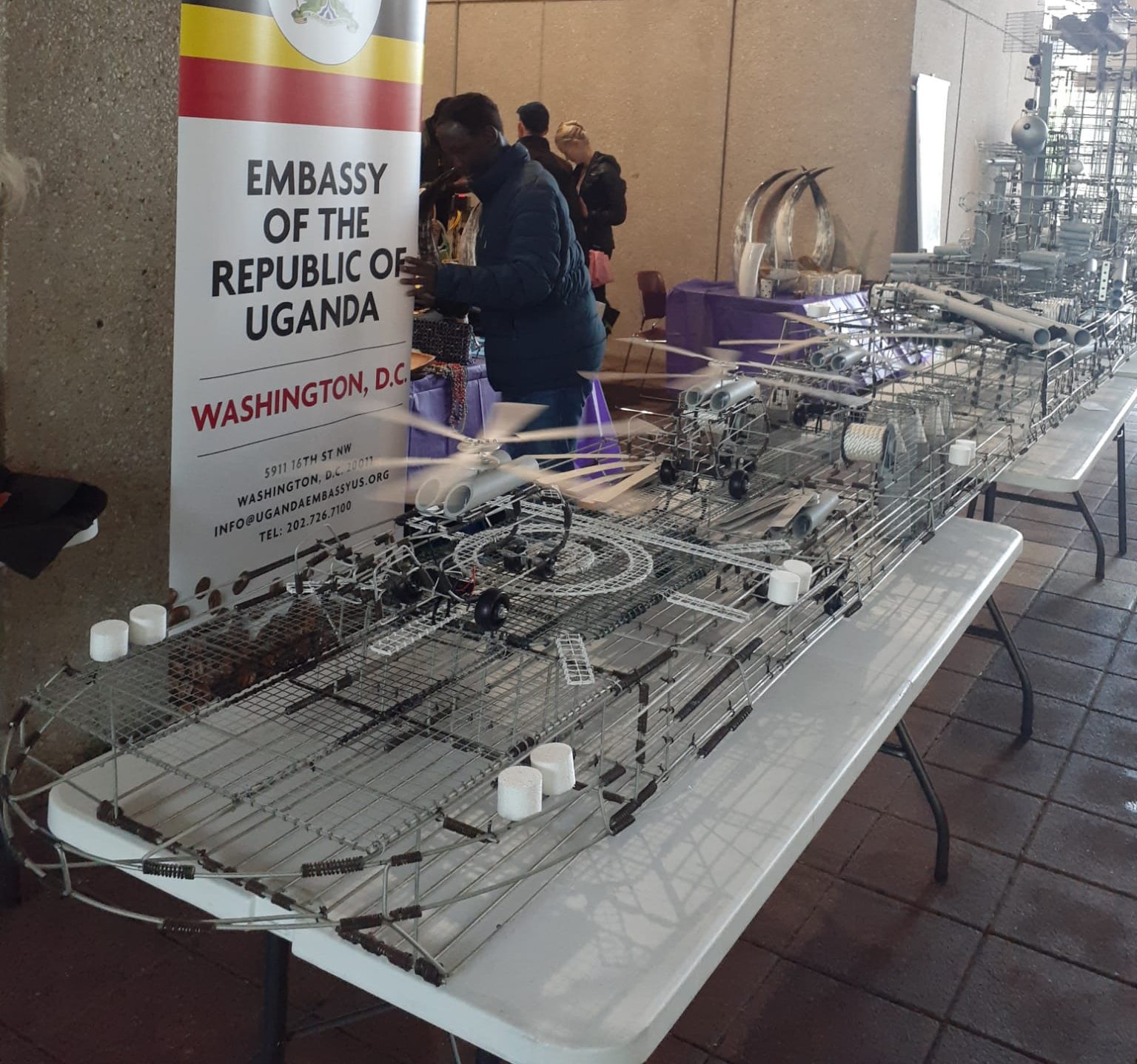 “We also exhibited a 34ft wire model battleship built by Ugandan national Ronald Nnam. Ronald, like many Ugandan kids, grew up making his own wire toy push cars and bicycles,” the embassy further revealed.