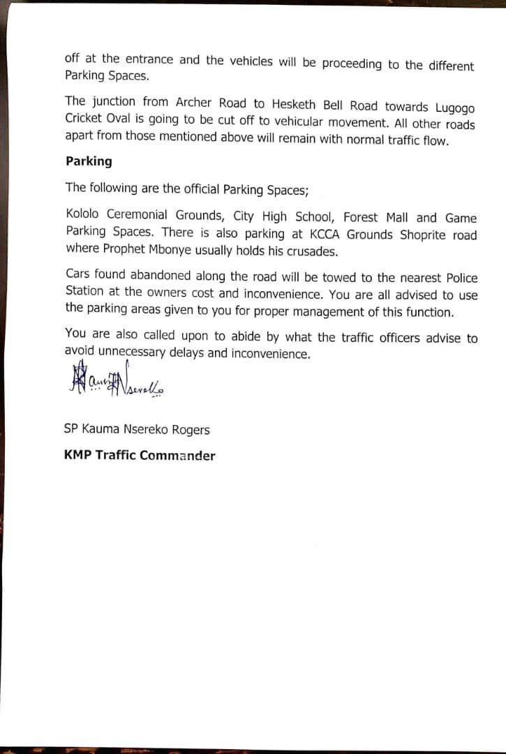The Commander of Traffic Police KMP, SP Kauma Nsereko Rogers, informed the public on Friday that some roads will be blocked off.