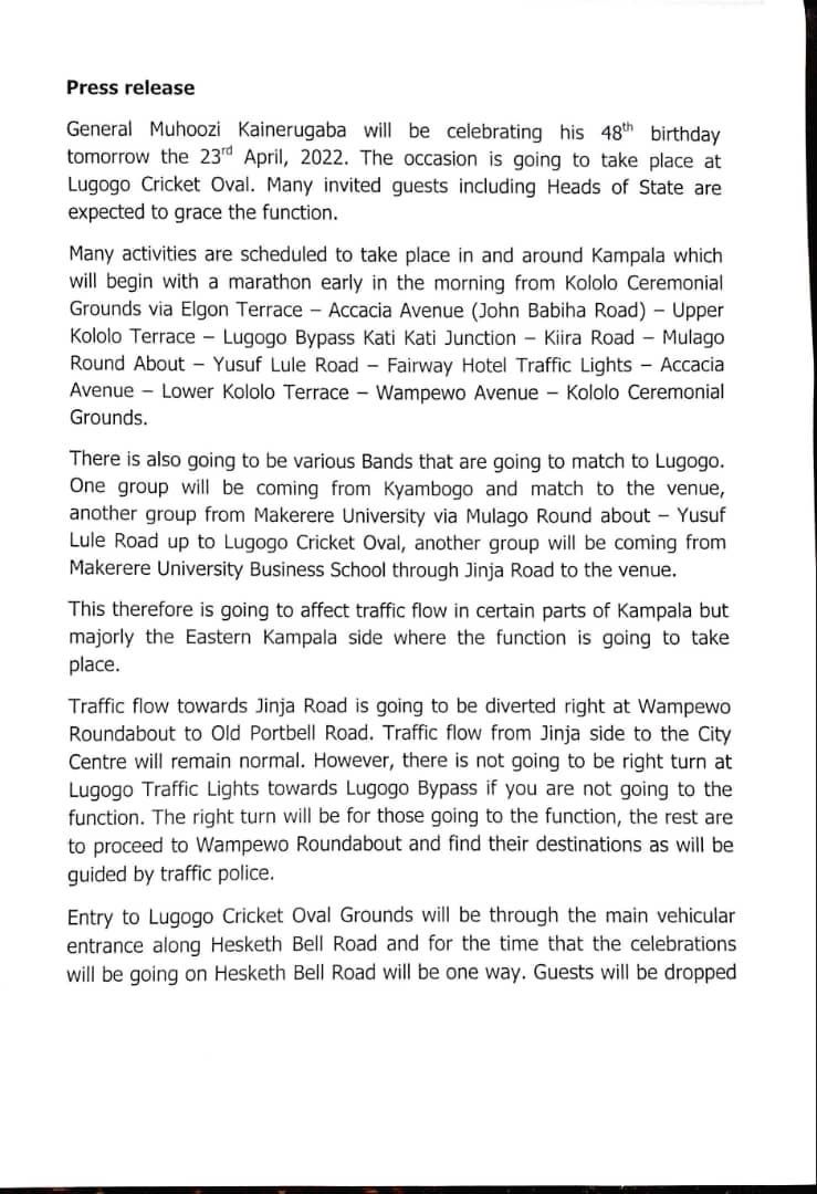 Police have announced that traffic in Kampala City will be diverted for Lt Gen Muhoozi Kainerugaba’s 48th birthday run.