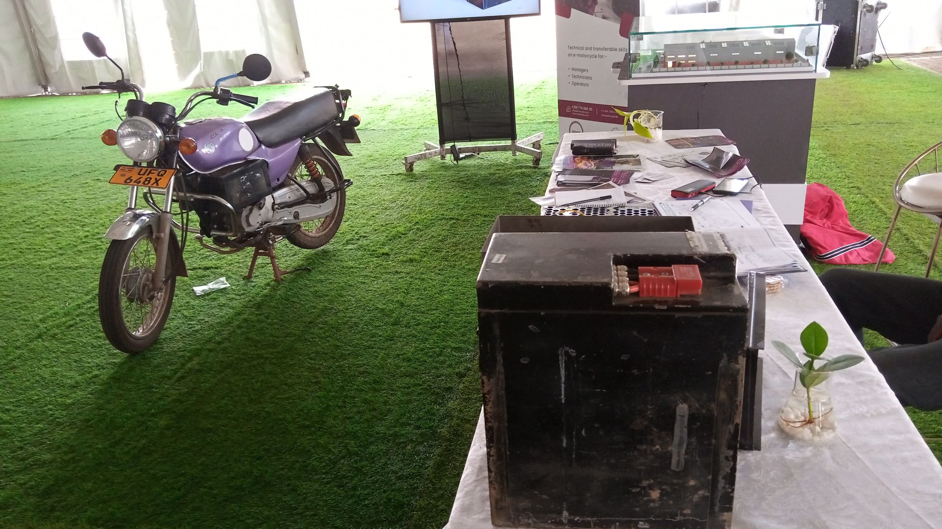 He says the battery replaces a fuel tank in the e-boda and can also be used for welding as well as generating electricity like a solar panel.