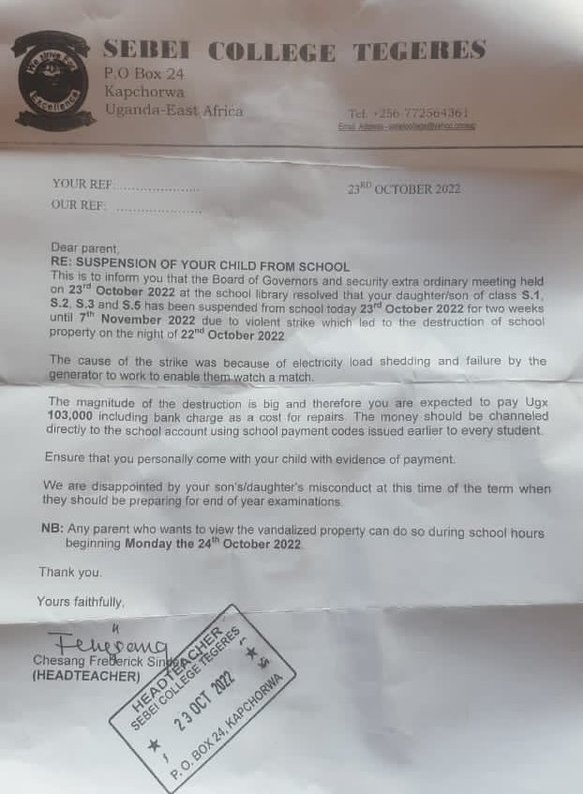 The head teacher, Frederic Chesang, in a suspension letter dated October 23, 2022 said the students are required to report back on 7th November upon paying Shs103,000 as a penalty.