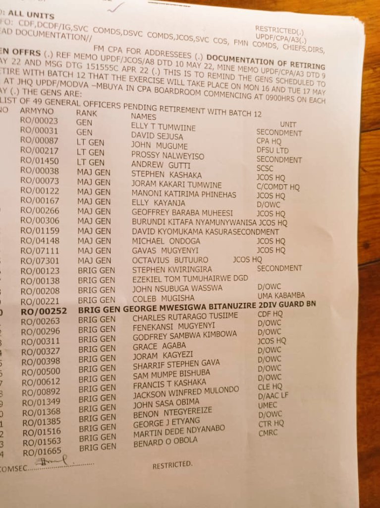 “This is to remind the generals scheduled to retire with batch 12 that the exercise will take place on Monday, May 16 and Tuesday, May 17 at the Ministry of Defence and Veteran Affairs Headquarters in Mbuya at 9am,” the memo reads in part.