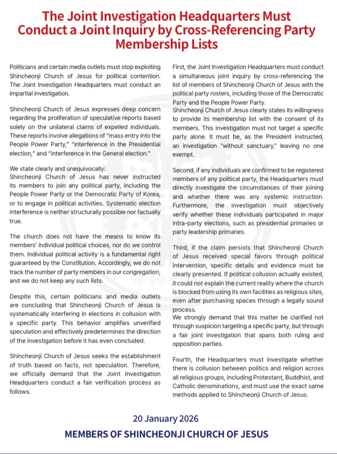 First, the Joint Investigation Headquarters must conduct a simultaneous joint inquiry by cross-referencing the list of members of Shincheonji Church of Jesus with the political party rosters, including those of the Democratic Party and the People Power Party.”