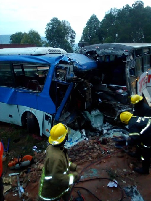 A Kenya-bound bus (Oxygen KCU 054L) collided with a Rwanda-bound bus (Volcano RAD798B) in Rwahi village, leaving scores injured.