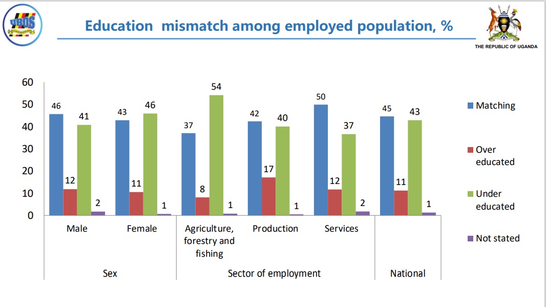 About 45% of those working have an education that matches their job, 11% are overqualified, 43% are under-educated and 1% are not stated.