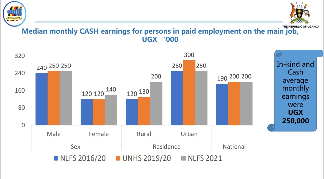 While releasing the findings of the survey, Michael Sijje Ogen, a Principal Statistician at UBOS, said the median monthly cash earnings for persons in paid employment on the main job is Shs200,000.