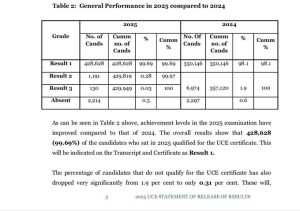 The 2025 results show significant improvement compared to 2024: 428,628 candidates (99.69%) qualified for the UCE certificate (Result 1), 1,191 candidates (0.28%) did not meet all award conditions (Result 2), and 130 candidates (0.03%) scored below the basic level in all subjects (Result 3).