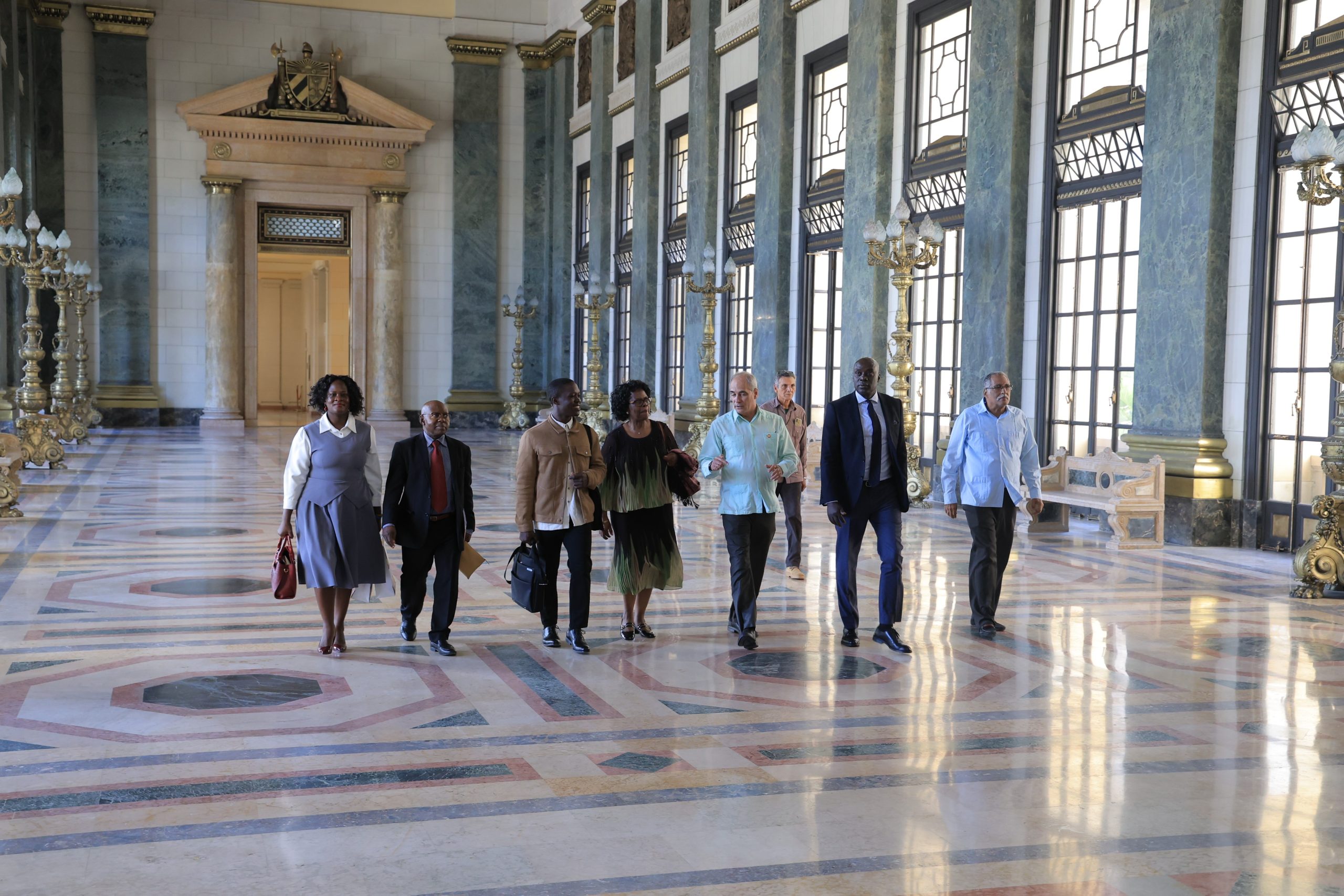 Mr. Alberto Núñez, President of the International Relations Committee of the Cuban National Assembly, conducts an official tour of the Cuban Parliament building for the visiting delegation from the Republic of Uganda, highlighting key historical and legislative features of the institution.