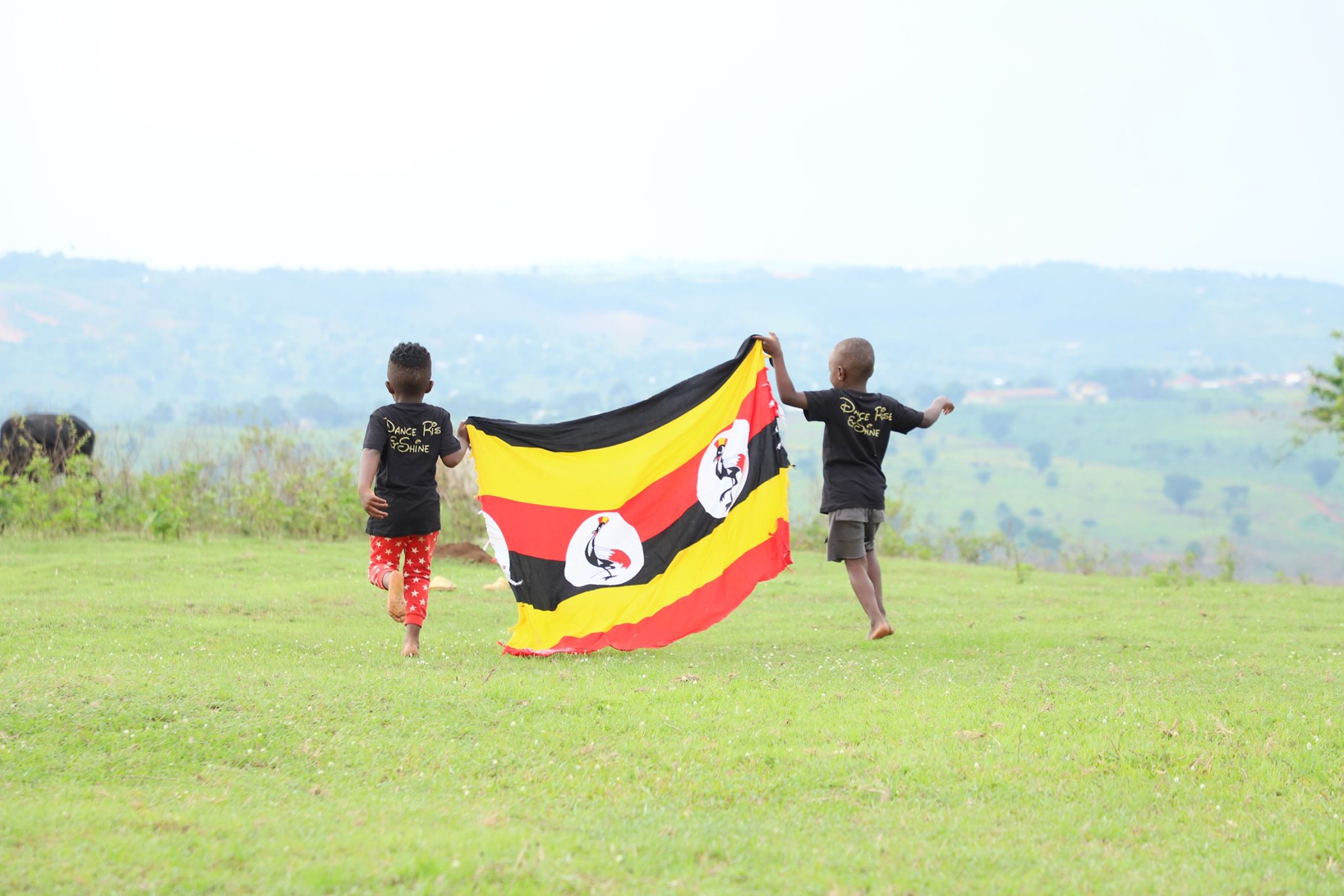 Symbolizing hope and a positive outlook, children run with the Ugandan flag. (Internet/ Courtsey Photo)