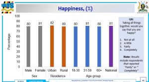 Key findings include: National happiness level: 81% (up from 77% in 2017), Urban happiness: 82%, Rural happiness: 80%, Female respondents: 81%, Male respondents: 80% and Age ranges (18–30, 31–59, 60+): All between 80% and 81%.
