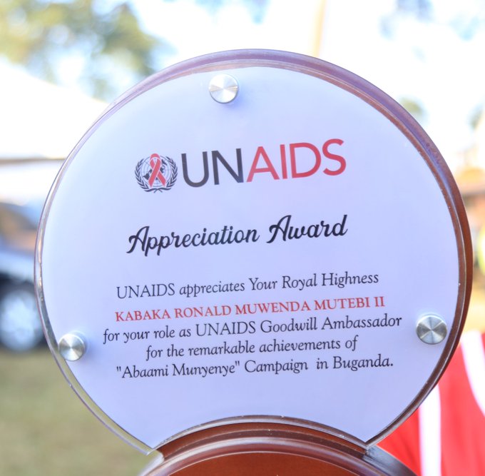 The United Nations World AIDS Program (UNAIDS) has presented the King of Buganda Kingdom, His Majesty Ronald Muwenda Mutebi II, with an award for his efforts in the fight against AIDS.