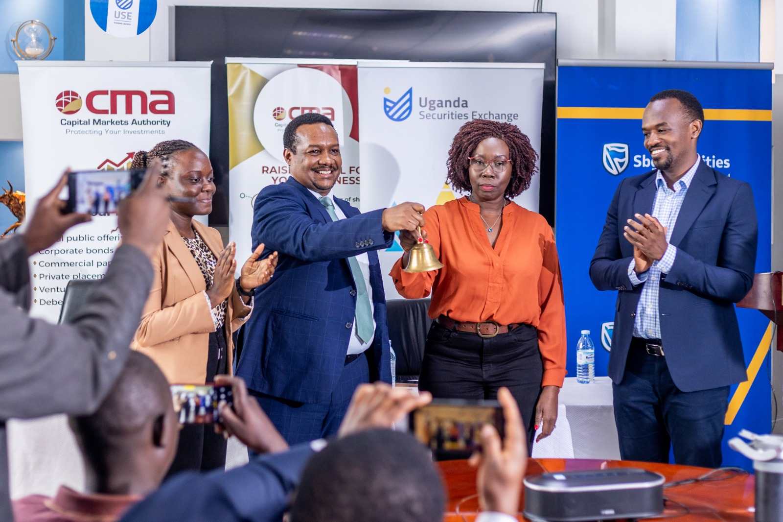 USE CEO Paul Bwiso rings a bell to launch the World Investor Week 2025 as CMA CEO Josephine Ossiya and Stanbic Bank’s Dale Sendagire cheer him on