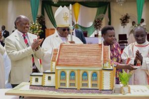 Prof Barnabas Nawangwe, Archbishop Paul Ssemogerere and VP Jessica Alupo cut the cake to mark the 85-year existence of the St. Augustine Catholic Community